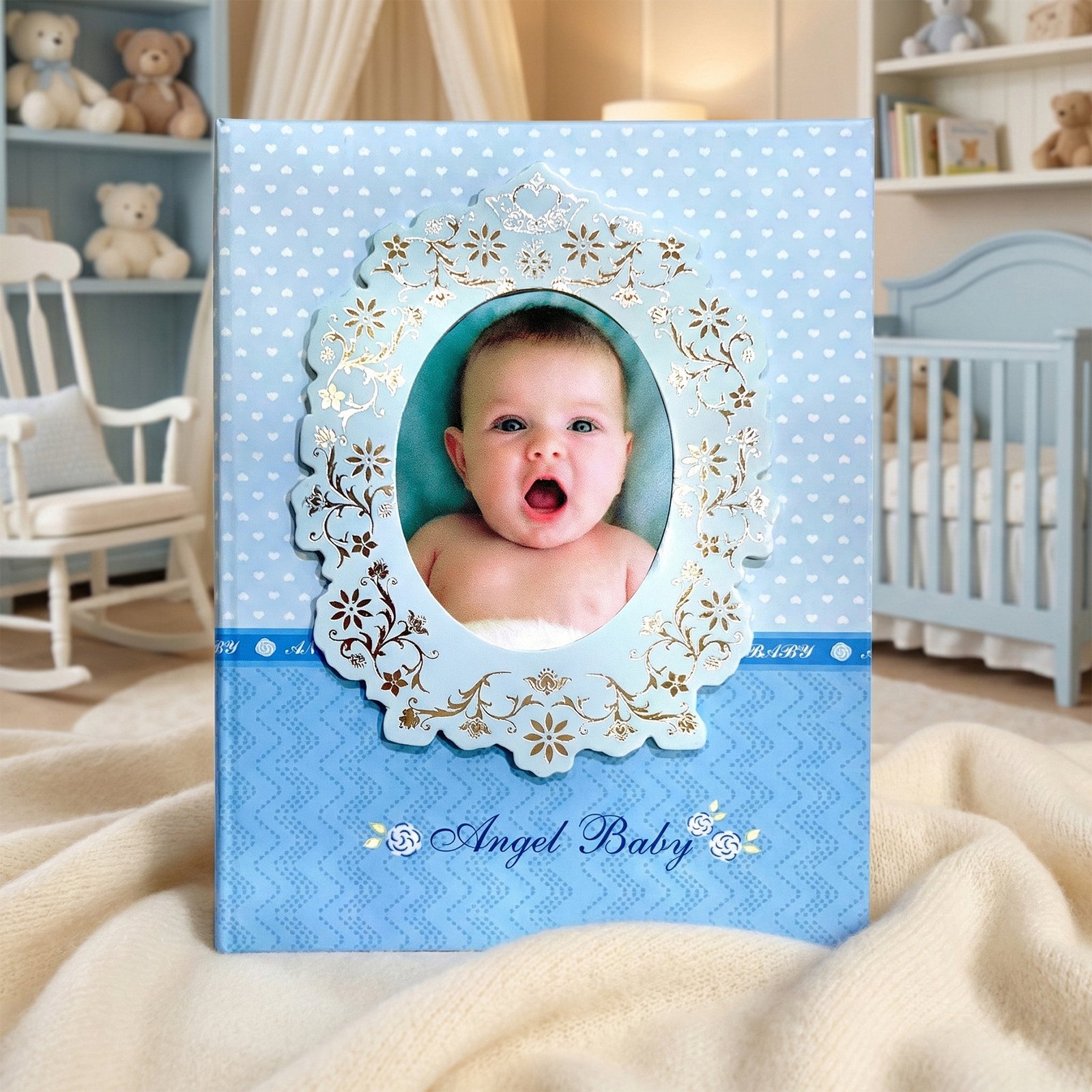 Bebeğinizin büyüme serüvenindeki en tatlı anları, telefon galerilerinde unutulmaya terk etmeyin! Pembe tonların hakim olduğu, biberon, beşik ve sallanan at gibi sevimli bebek figürleriyle süslenmiş bu özel albüm, minik prensesinizin anılarını sonsuza dek saklamanız için tasarlandı.